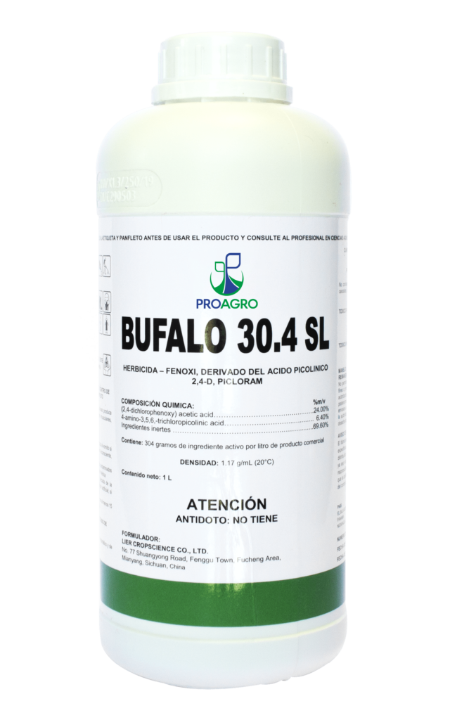 Home > Phytosanitary > Bufalo 30.4 SL Ficha Técnica Bufalo 30.4 SL Es sistémico selectivo que actúa en el control de malezas propias en los pastizales. Herbicida selectivo de post emergencia. Ingrediente Activo: Picloram + 2,4-D 30.4 SL. Huisquilite, dormilona, flor amarilla, zarza y verbena. Usos CAÑA DE AZÚCAR MAÍZ PASTO Consulta con nuestros expertos…