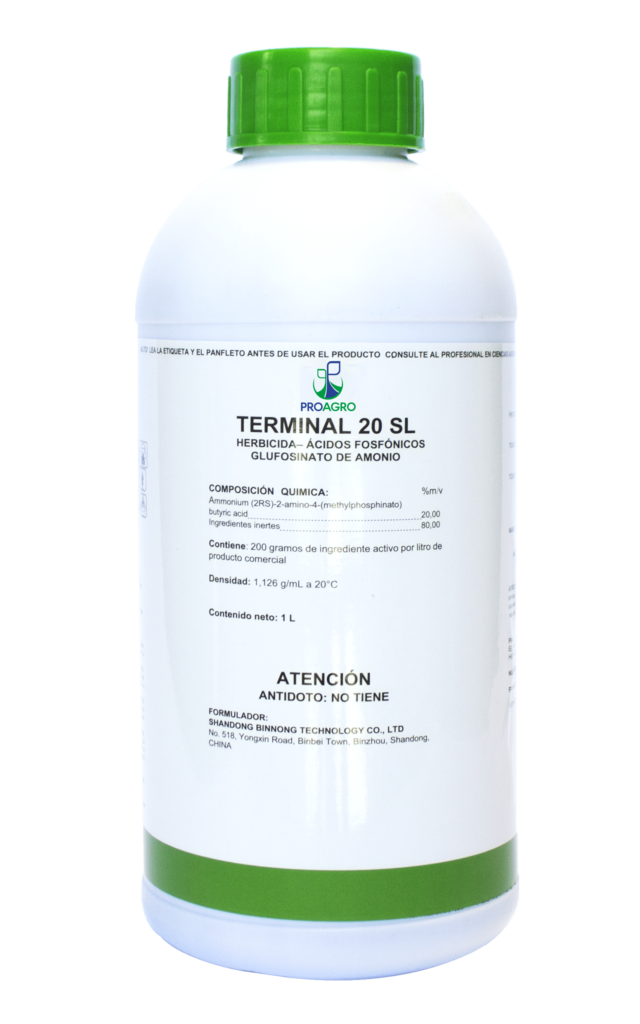 Home > Phytosanitary > Terminal 20 SL Ficha Técnica Terminal 20 SL Es un herbicida de contacto no selectivo para el control de malezas anuales, gramíneas y hoja ancha, en aplicaciones de post emergencia en cultivos, frutales y vides. Ingrediente Activo: Glufosinato de amonio 20 SL Controla: Ortiga, senecio, quinguilla, coniza, mostacilla, zanahoria silvestre, hierba…